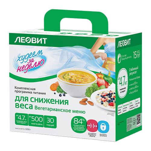 Комплексная программа питания Ловит «Худеем за неделю – Вегетарианское меню» поможет очистить организм от токсинов, уменьшить аппетит и быстро избавиться от лишнего веса благодаря эффективному жиросжигающему комплексу. Мы всё сделали за вас – подобрали ингредиенты, посчитали калории и разработали полезный и вкусный рацион на 5 дней. Как раз хватит на рабочую неделю. Мы также подготовили рекомендации, как питаться на 6-й и 7-й день программы, чтобы закрепить полученный результат – их вы найдёте в коробке с курсом.
