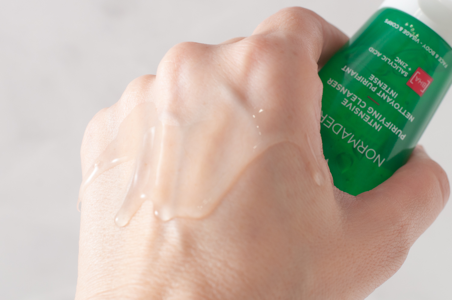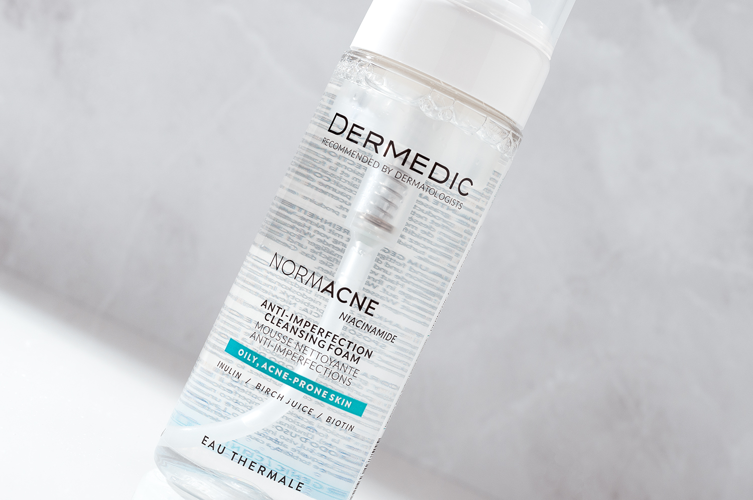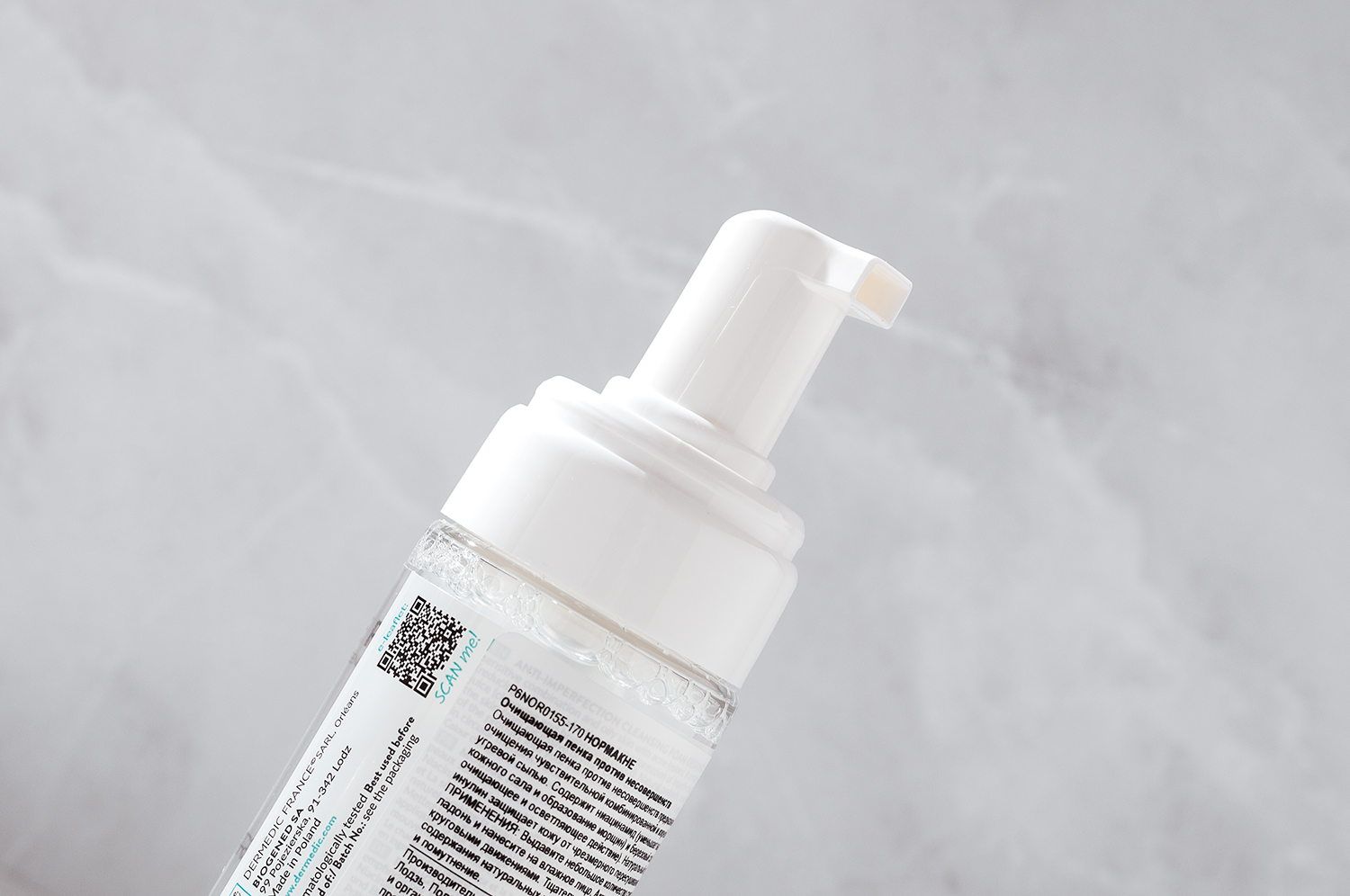 Текстура у него ближе к жидкой, аромат нейтральный. Небольшая порция средства образует обильную шапку негустой пены, которая тщательно очищает кожу. Ощущения скрипа после нет, а чувство чистоты есть. Из активных компонентов в составе есть термальная вода, бетаин, цинк, а также экстракт зеленого чая.