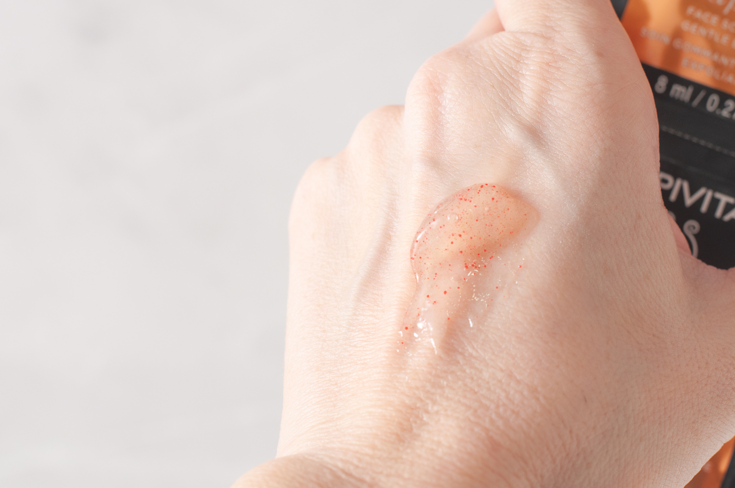 Скраб имеет прозрачную гелевую текстуру с мелкими вкраплениями скрабирующих частиц оранжевого цвета. Выглядит это так, что хочется поскорее воспользоваться. А еще он классно пахнет фруктами.